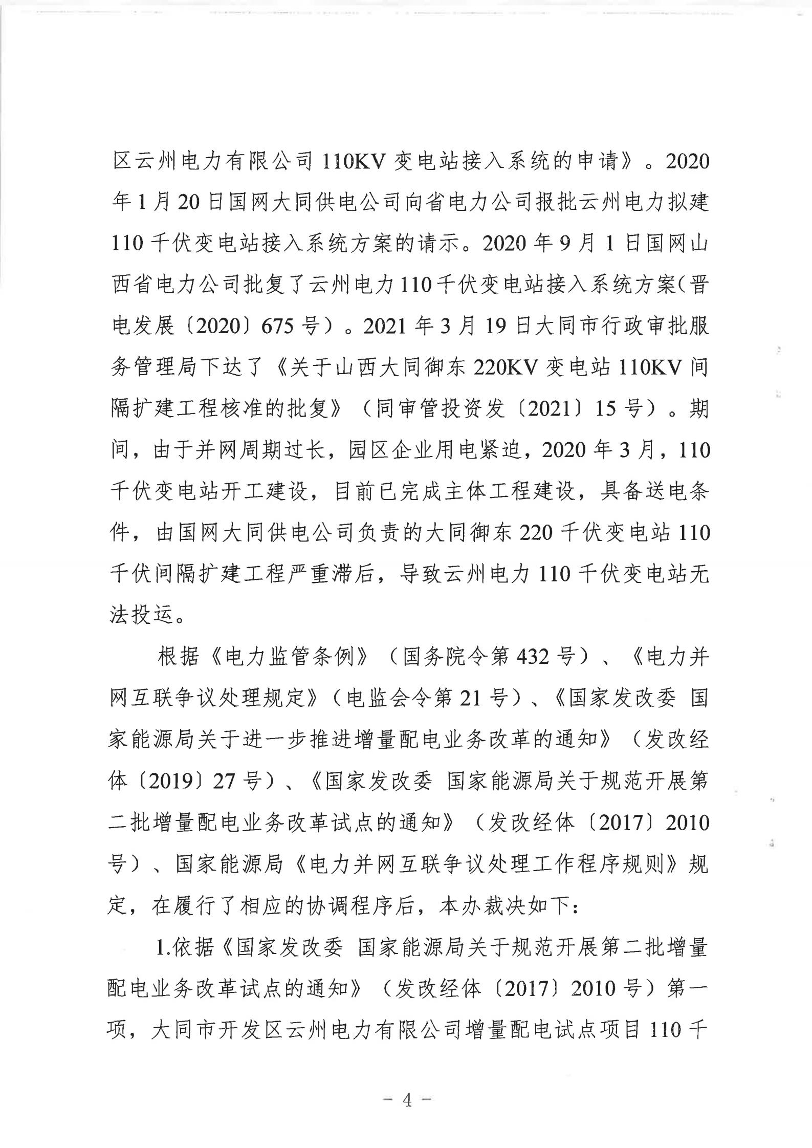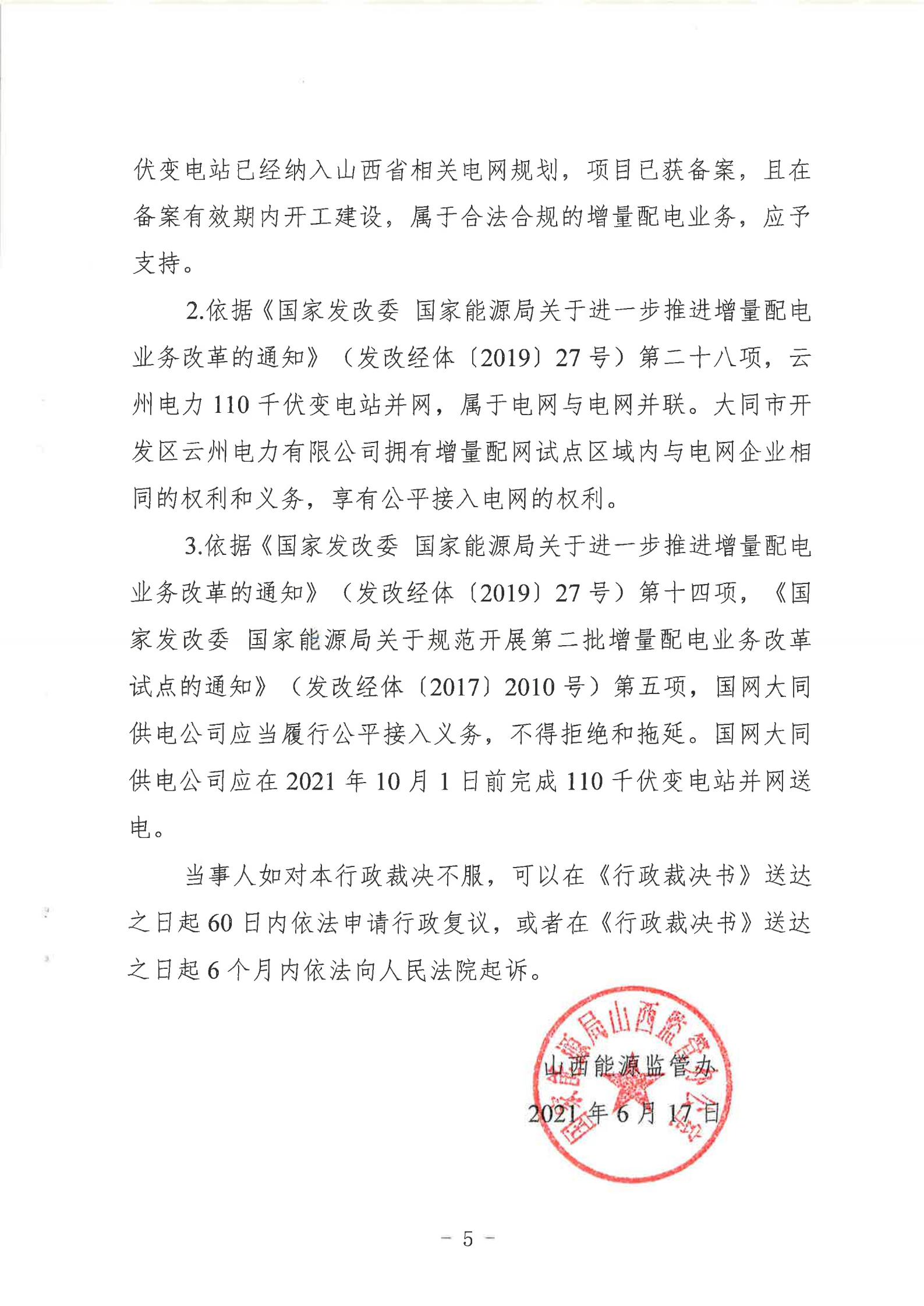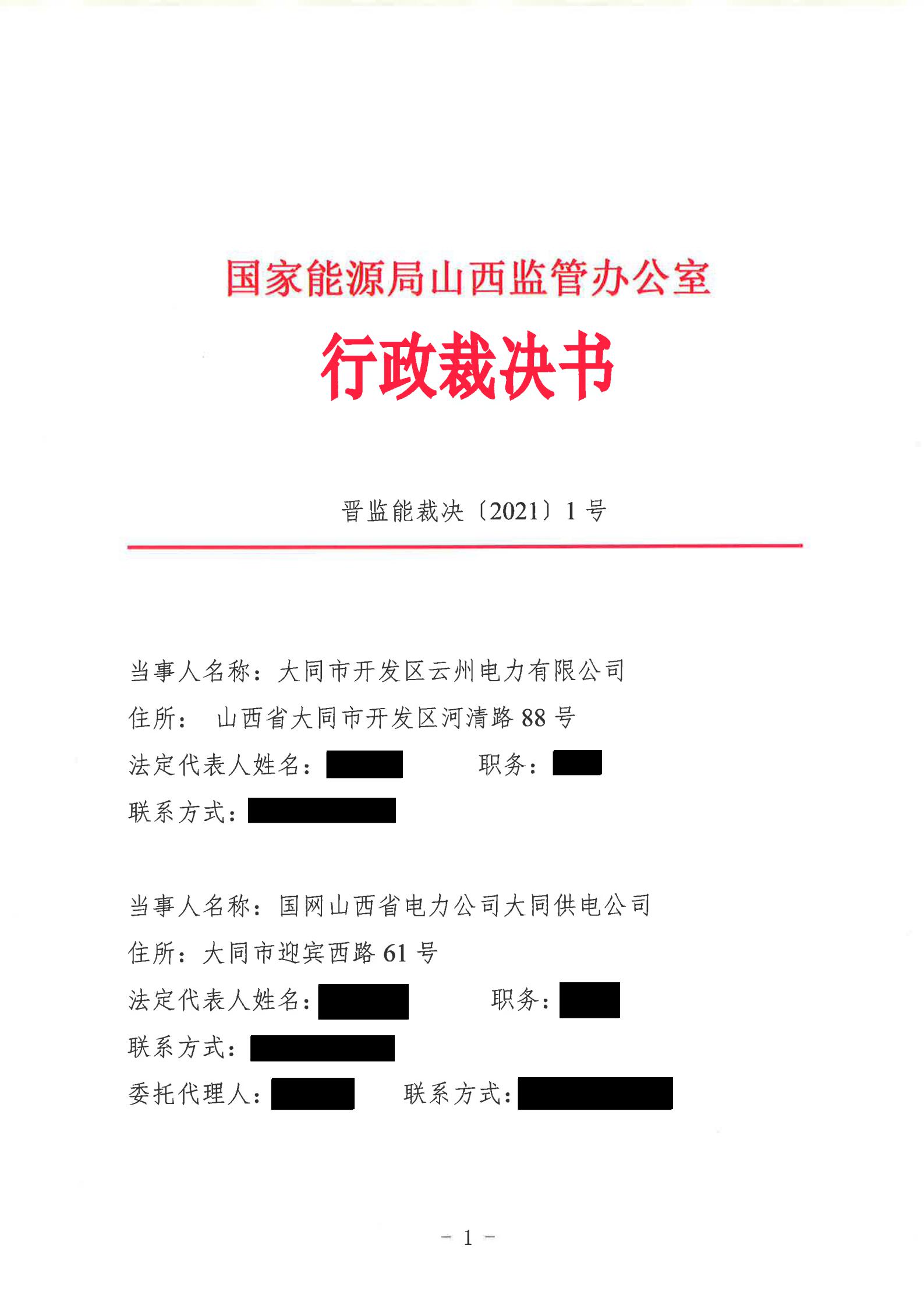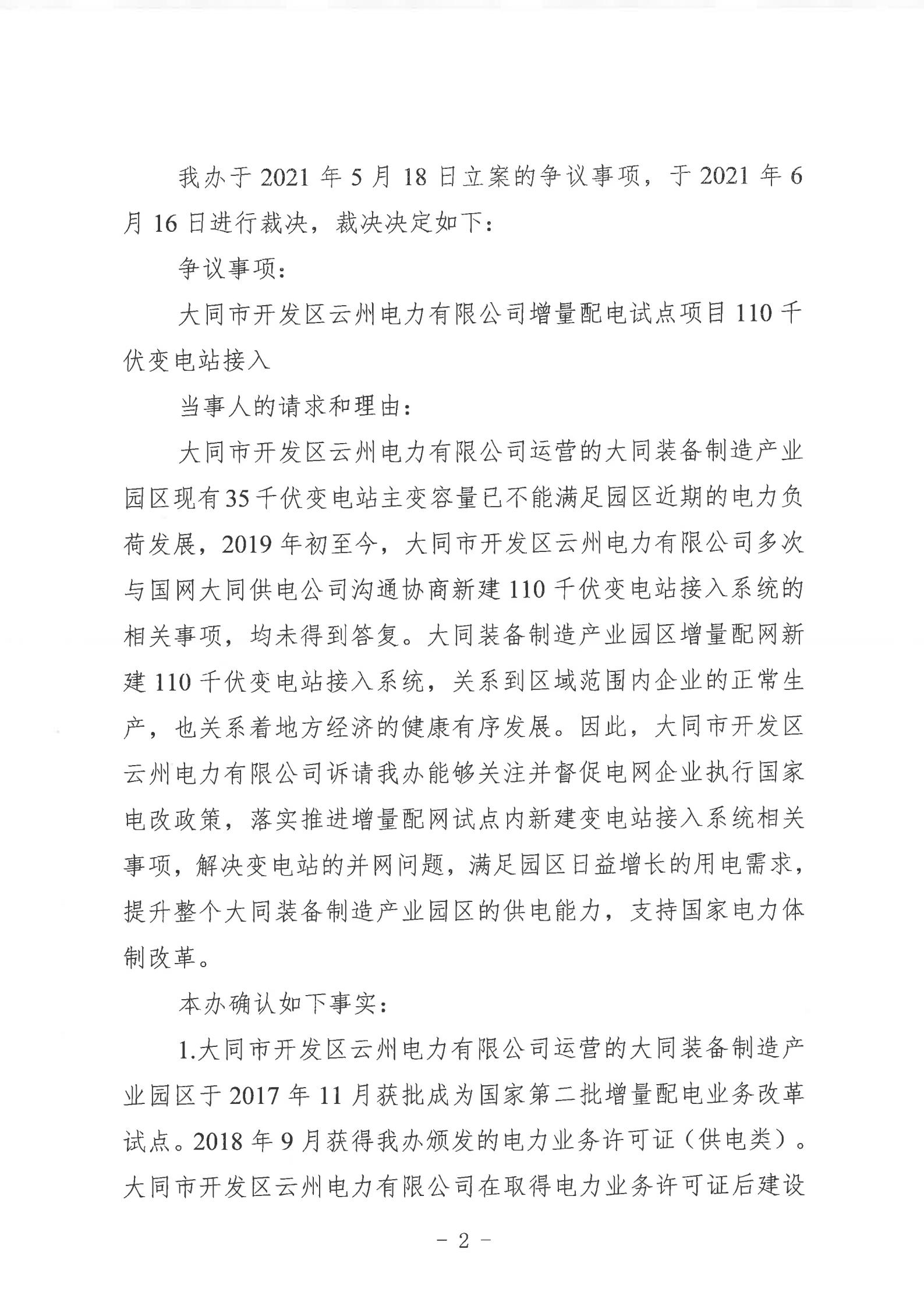 山西能監(jiān)辦近日發(fā)布行政裁決書(晉監(jiān)能裁決【2021】1號),裁決書顯示,山西能監(jiān)辦于2021年5月18日立案爭議事項,于2021年6月16日進行裁決。爭議事項為大同市開發(fā)區(qū)云州電力有限公增量配電試點項目110千伏變電站接入。 當事人的請求和理由:大同市開發(fā)區(qū)云州電力有限公司運營的大同裝備制造產(chǎn)業(yè)園區(qū)現(xiàn)有35千伏變電站主變?nèi)萘恳巡荒軡M足園區(qū)近期的電力負荷發(fā)展,2019年初至今,大同市開發(fā)區(qū)云州電力有限公司多次與國網(wǎng)大同供電公司溝通協(xié)商新建110千伏變電站接入系統(tǒng)的相關(guān)事項,均未得到答復(fù)。大同市開發(fā)區(qū)云州電力有限公司訴請山西能監(jiān)辦能夠關(guān)注并督促電網(wǎng)企業(yè)執(zhí)行國家電改政策,落實推進增量配網(wǎng)試點內(nèi)新建變電站接入系統(tǒng)相關(guān)事項,解決變電站的并網(wǎng)問題,滿足園區(qū)日益增長的用電需求,提升整個大同裝備制造產(chǎn)業(yè)園區(qū)的供電能力。 山西能監(jiān)辦裁決: 大同市開發(fā)區(qū)云州電力有限公司增量配電試點項目110千伏變電站已經(jīng)納入山西省相關(guān)電網(wǎng)規(guī)劃,項目已獲備案,且在備案有效期內(nèi)開工建設(shè),屬于合法合規(guī)的增量配電業(yè)務(wù),應(yīng)予支持。 大同市開發(fā)區(qū)云州電力有限公司擁有增量配網(wǎng)試點區(qū)域內(nèi)與電網(wǎng)企業(yè)相同的權(quán)利與義務(wù),享有公平接入電網(wǎng)的權(quán)利。 國網(wǎng)大同供電公司應(yīng)當履行公平接入義務(wù),不得拒絕和拖延。國網(wǎng)大同供電公司應(yīng)在2021年10月1日前完成110千伏變電站并網(wǎng)送電。 以下為原文: