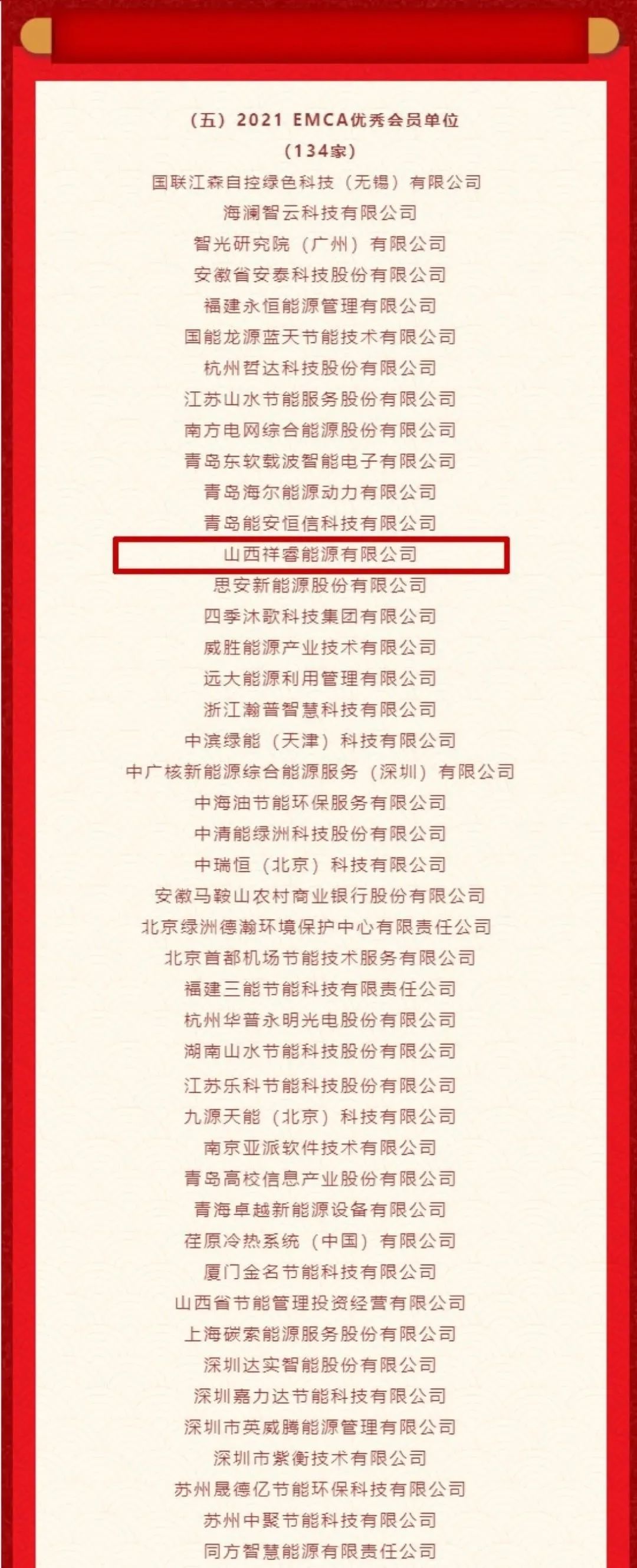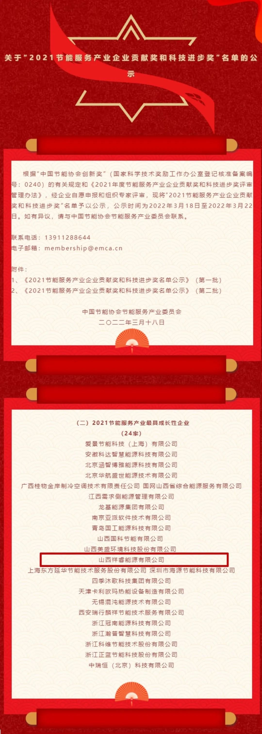 3月18日,中國節(jié)能協(xié)會節(jié)能服務(wù)產(chǎn)業(yè)委員會發(fā)布了關(guān)于《2021節(jié)能服務(wù)產(chǎn)業(yè)企業(yè)貢獻(xiàn)獎和科技進(jìn)步獎名單的公示》。山西祥睿能源有限公司榮登榜單,入選“2021年節(jié)能服務(wù)產(chǎn)業(yè)最具成長性企業(yè)”和“2021EMCA優(yōu)秀會員單位”稱號。