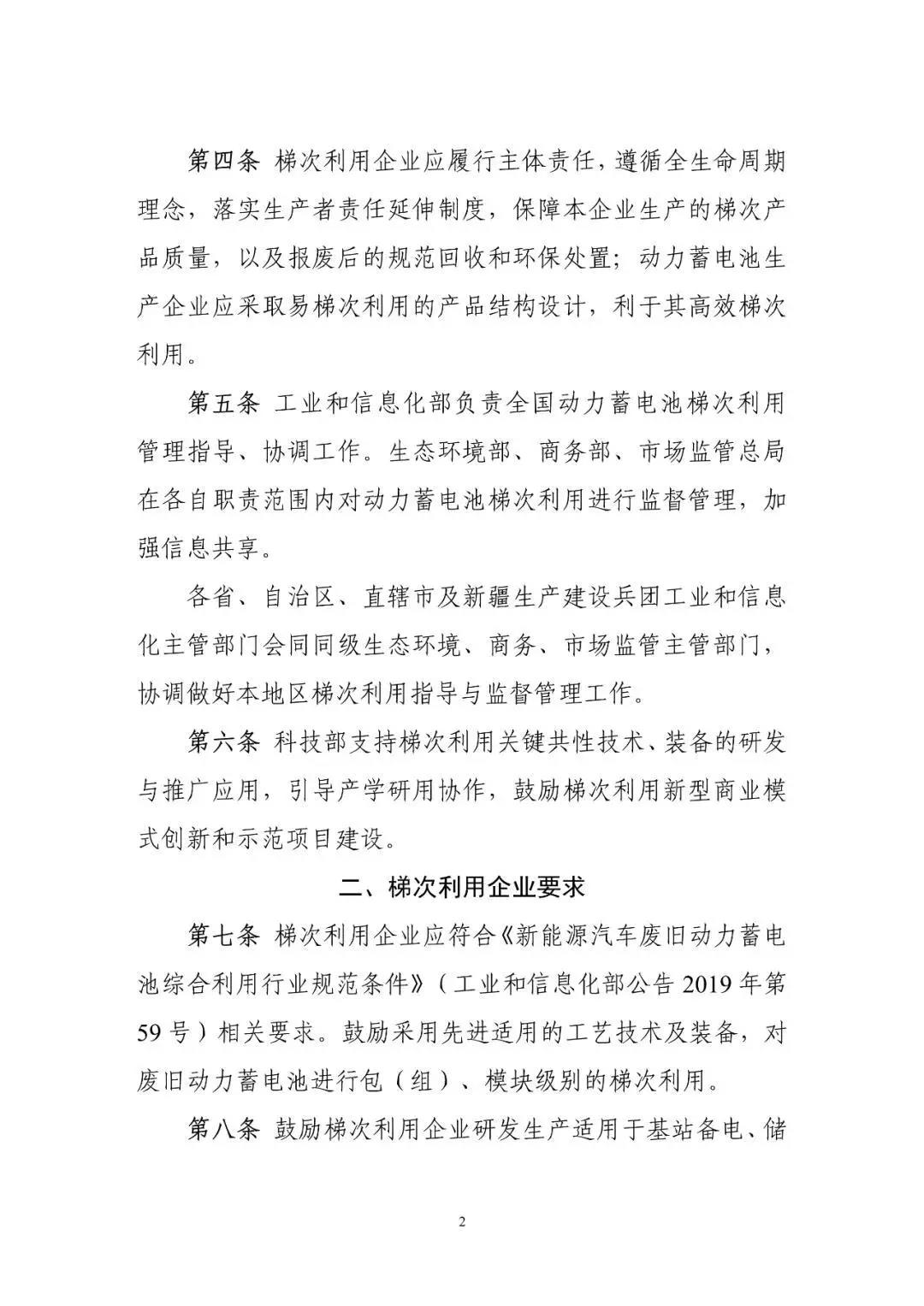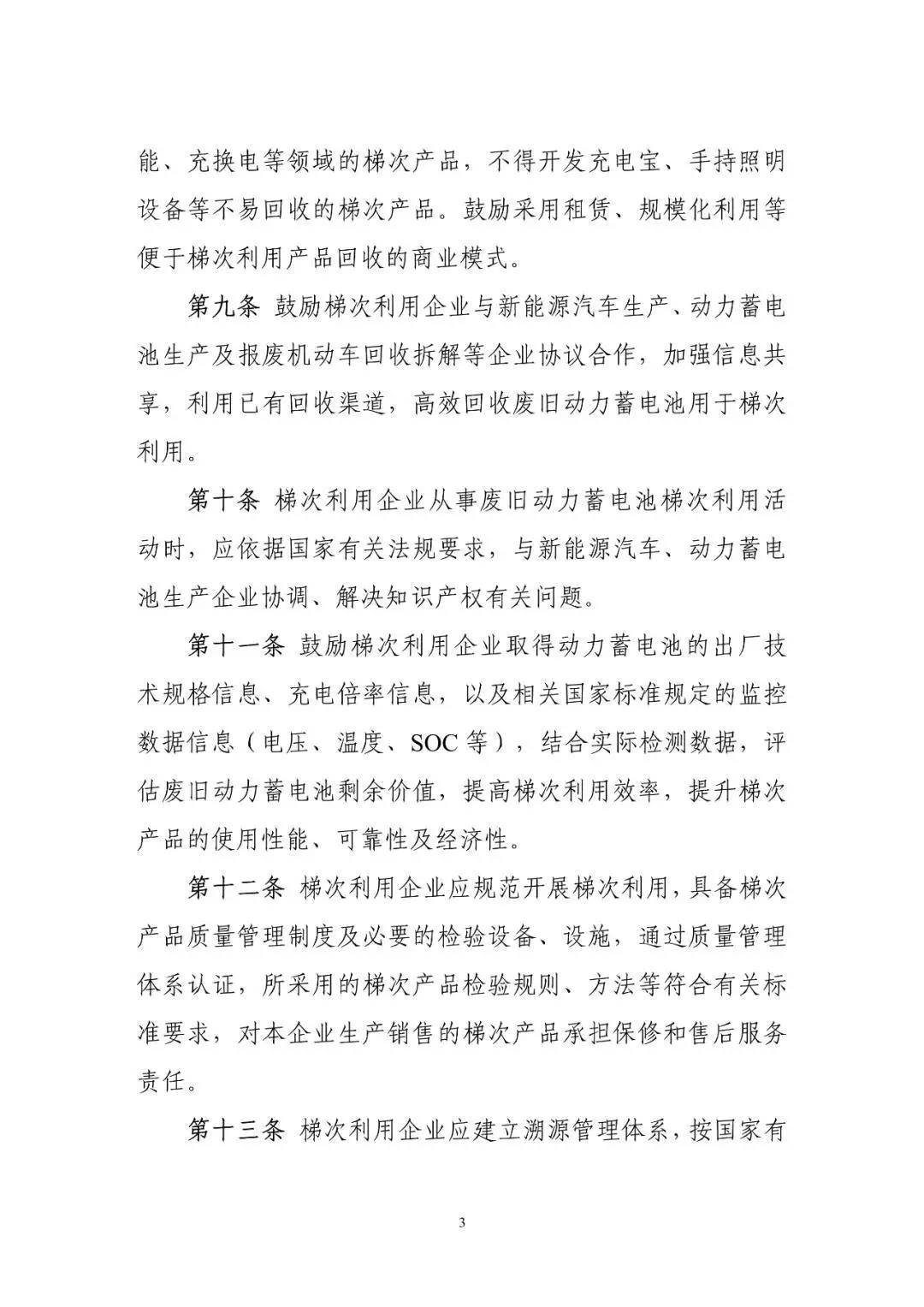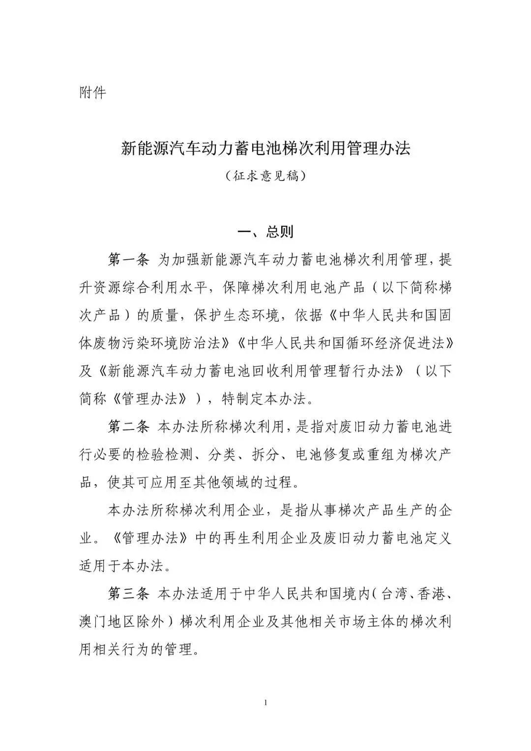 10月10日工信部開始就《新能源汽車動(dòng)力蓄電池梯次利用管理辦法》公開征求意見,意見稿指出鼓勵(lì)梯次利用企業(yè)研發(fā)生產(chǎn)適用于基站備電、儲(chǔ)能、充換電等領(lǐng)域的梯次產(chǎn)品,鼓勵(lì)采用租賃、規(guī)?;瘧?yīng)用等便于梯次利用產(chǎn)品回收的商業(yè)模式。鼓勵(lì)梯次利用企業(yè)取得動(dòng)力電池的出廠技術(shù)規(guī)格信息、充電倍率信息,以及電壓、溫度、SOC等信息,評(píng)估廢舊動(dòng)力電池剩余價(jià)值,提高梯次利用效率,提升產(chǎn)品的使用性能、可靠性及經(jīng)濟(jì)性。 文丨工信部 《新能源汽車動(dòng)力蓄電池梯次利用管理辦法》公開征求意見 為加強(qiáng)新能源汽車動(dòng)力蓄電池梯次利用管理,提升資源綜合利用水平,保障梯次利用電池產(chǎn)品的質(zhì)量,我們組織編制了《新能源汽車動(dòng)力蓄電池梯次利用管理辦法》?,F(xiàn)將征求意見稿向社會(huì)公開征求意見,如有意見或建議,請(qǐng)于2020年11月8日前反饋工業(yè)和信息化部節(jié)能與綜合利用司。 聯(lián)系人及電話:艾崇 010-68205360 傳真:010-68205337 電子信箱:zyzhly@miit.gov.cn 附件:新能源汽車動(dòng)力蓄電池梯次利用管理辦法(征求意見稿) 工業(yè)和信息化部節(jié)能與綜合利用司 2020年10月10日