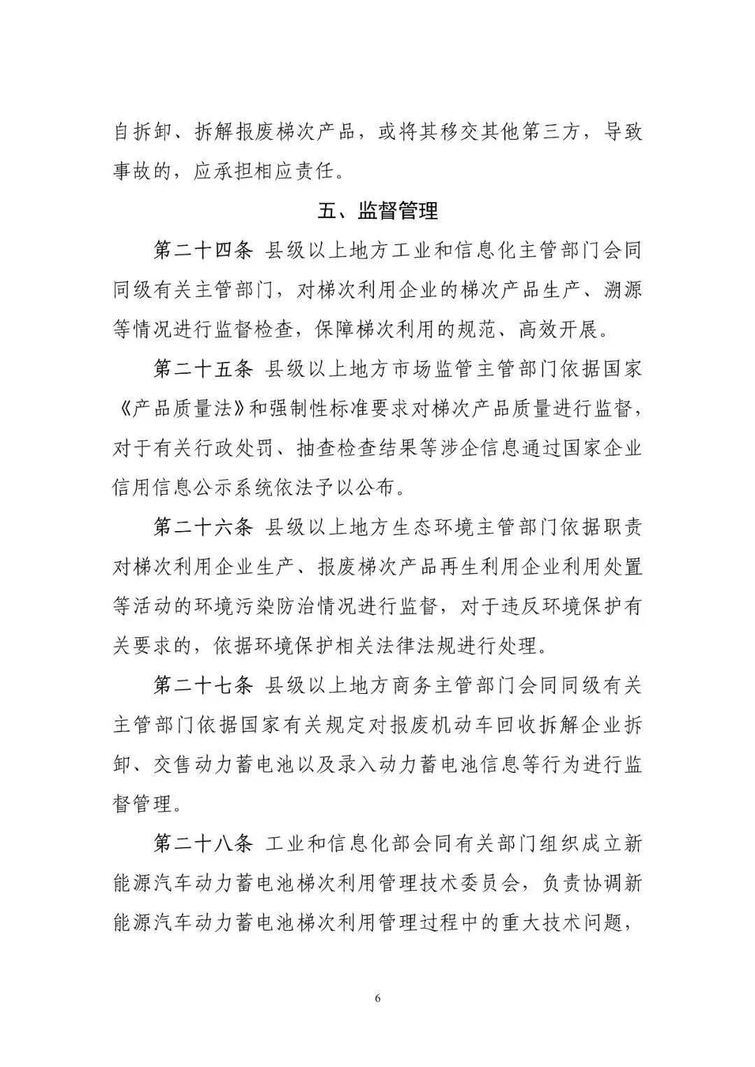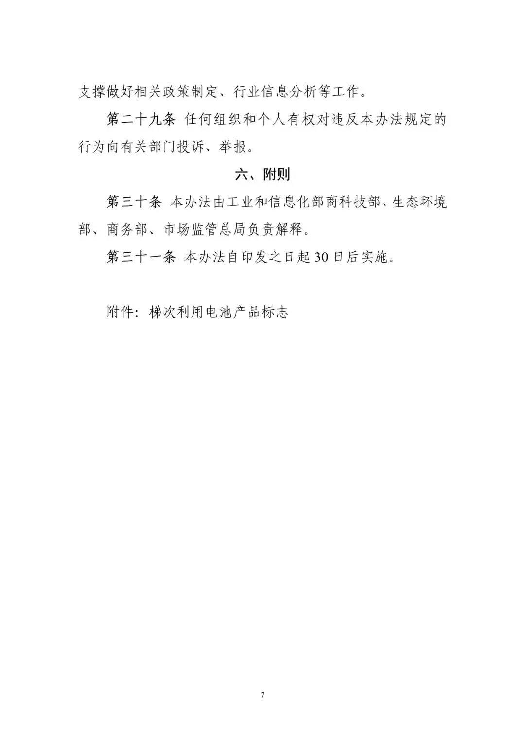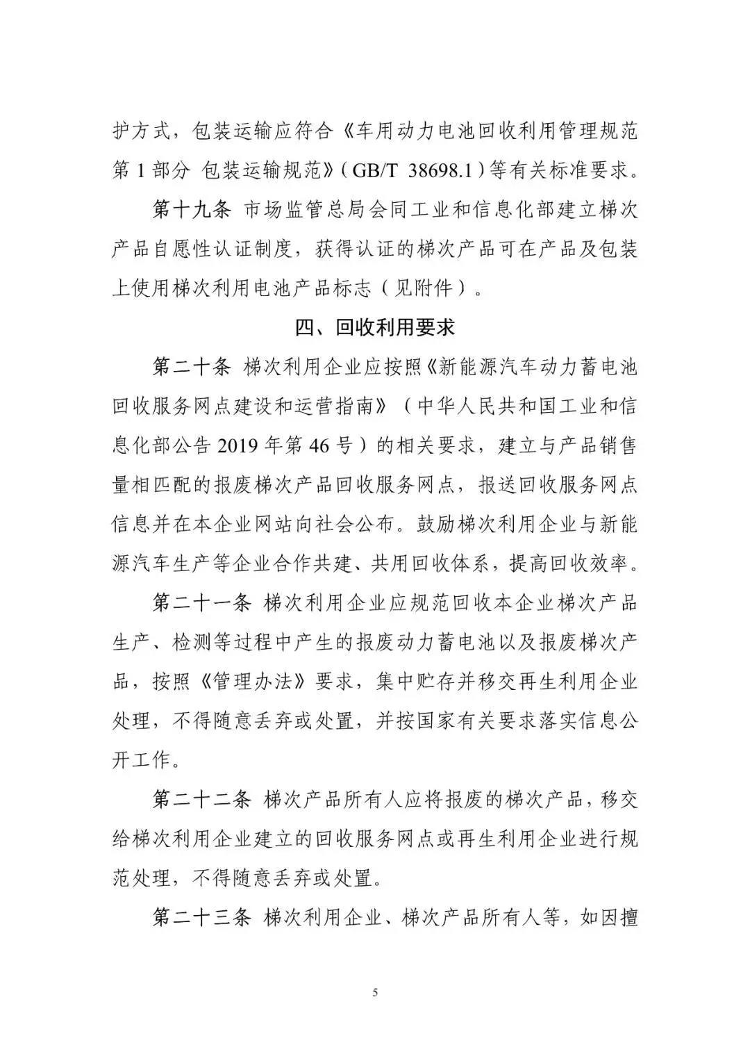 10月10日工信部開始就《新能源汽車動(dòng)力蓄電池梯次利用管理辦法》公開征求意見,意見稿指出鼓勵(lì)梯次利用企業(yè)研發(fā)生產(chǎn)適用于基站備電、儲(chǔ)能、充換電等領(lǐng)域的梯次產(chǎn)品,鼓勵(lì)采用租賃、規(guī)?;瘧?yīng)用等便于梯次利用產(chǎn)品回收的商業(yè)模式。鼓勵(lì)梯次利用企業(yè)取得動(dòng)力電池的出廠技術(shù)規(guī)格信息、充電倍率信息,以及電壓、溫度、SOC等信息,評(píng)估廢舊動(dòng)力電池剩余價(jià)值,提高梯次利用效率,提升產(chǎn)品的使用性能、可靠性及經(jīng)濟(jì)性。 文丨工信部 《新能源汽車動(dòng)力蓄電池梯次利用管理辦法》公開征求意見 為加強(qiáng)新能源汽車動(dòng)力蓄電池梯次利用管理,提升資源綜合利用水平,保障梯次利用電池產(chǎn)品的質(zhì)量,我們組織編制了《新能源汽車動(dòng)力蓄電池梯次利用管理辦法》?,F(xiàn)將征求意見稿向社會(huì)公開征求意見,如有意見或建議,請(qǐng)于2020年11月8日前反饋工業(yè)和信息化部節(jié)能與綜合利用司。 聯(lián)系人及電話:艾崇 010-68205360 傳真:010-68205337 電子信箱:zyzhly@miit.gov.cn 附件:新能源汽車動(dòng)力蓄電池梯次利用管理辦法(征求意見稿) 工業(yè)和信息化部節(jié)能與綜合利用司 2020年10月10日