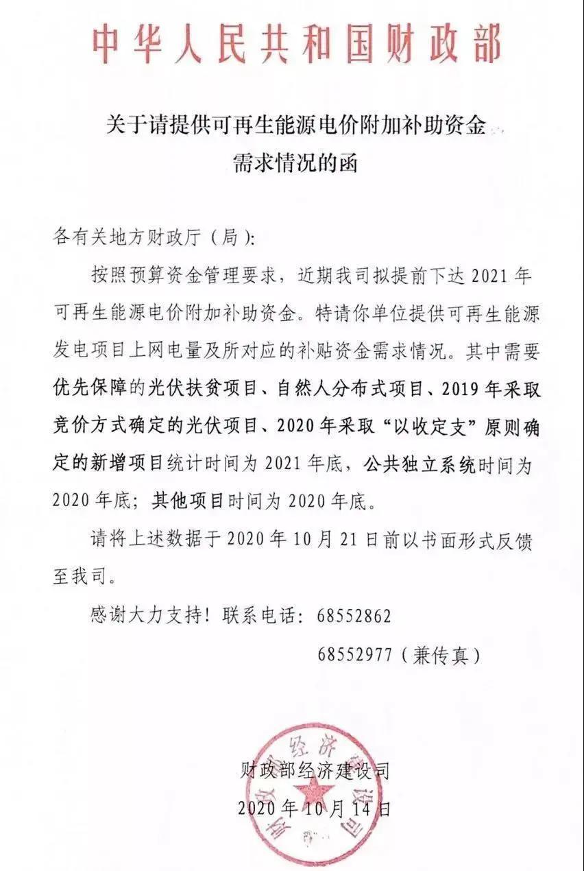 財政部下發(fā)了《關(guān)于請?zhí)峁┛稍偕茉措妰r附加補(bǔ)助資金需求情況的函》,擬提前下發(fā)2021年可再生能源電價附加補(bǔ)助資金。 通知明確表示,將優(yōu)先保障光伏扶貧項(xiàng)目、自然人分布式項(xiàng)目、2019年競價光伏項(xiàng)目、2020年“以收定支”新增項(xiàng)目。補(bǔ)貼時間截止為2021年底,公共獨(dú)立系統(tǒng)和其他項(xiàng)目的補(bǔ)貼截止時間為2020年底。 統(tǒng)計(jì)申報截止時間為2020年10月21日。