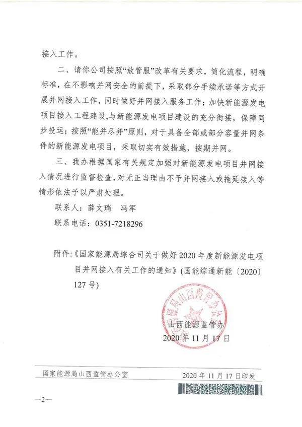 11月19日,山西能源監(jiān)管辦印發(fā)《山西能源監(jiān)管辦關于做好2020年度新能源發(fā)電項目并網接入有關工作的通知》,要求電網企業(yè)簡化工作流程,明確接入標準,按照“能并盡并”原則,對于具備全部或部分容量并網條件的新能源發(fā)電項目,采取切實有效措施,全力統(tǒng)籌做好新能源發(fā)電項目并網接入工作,確保按期并網。 下一步,山西能源監(jiān)管辦將進一步加強新能源發(fā)電項目并網接入情況進行監(jiān)督檢查,對無正當理由不予并網接入或拖延接入等情形依法予以嚴肅處理。 文件全文如下: |